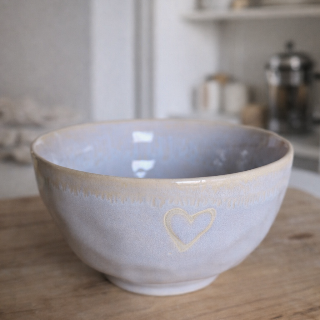 Son détail cœur discret, associé à une teinte blanc polaire, lui donne une présence douce et réconfortante sur la table. Chaque pièce est fabriquée à la main, ce qui la rend unique, avec de légères variations qui font tout son charme.